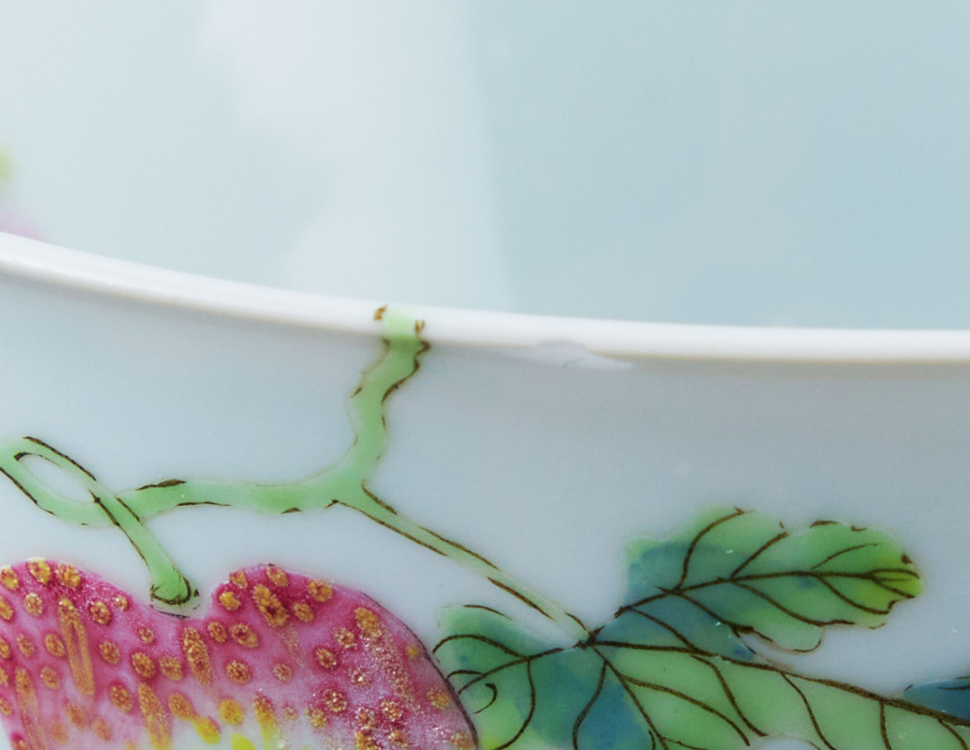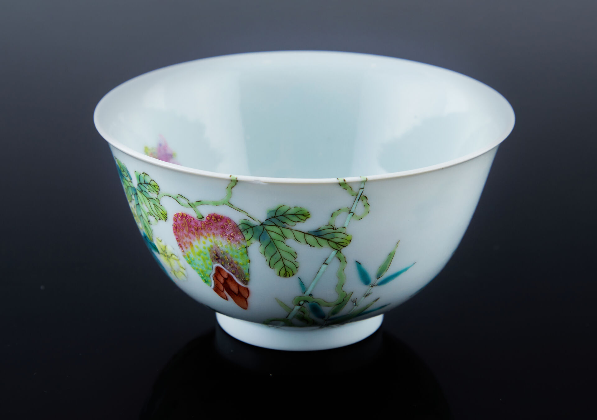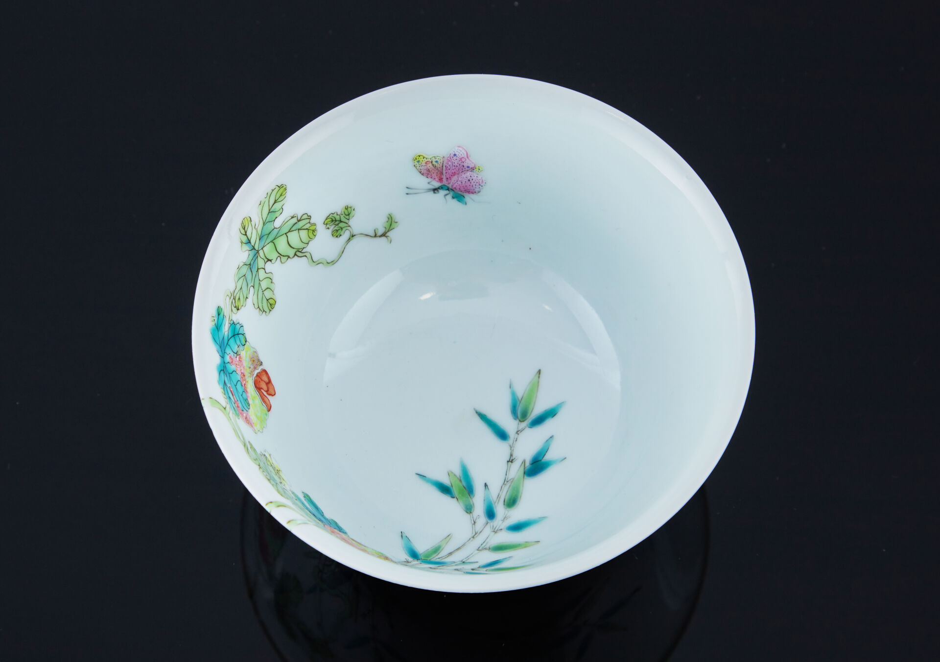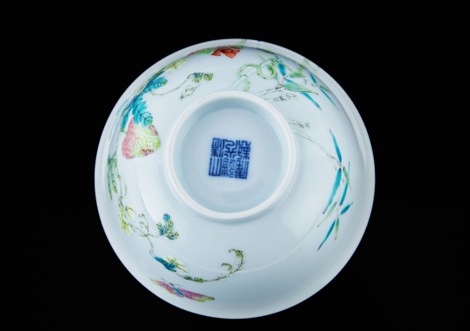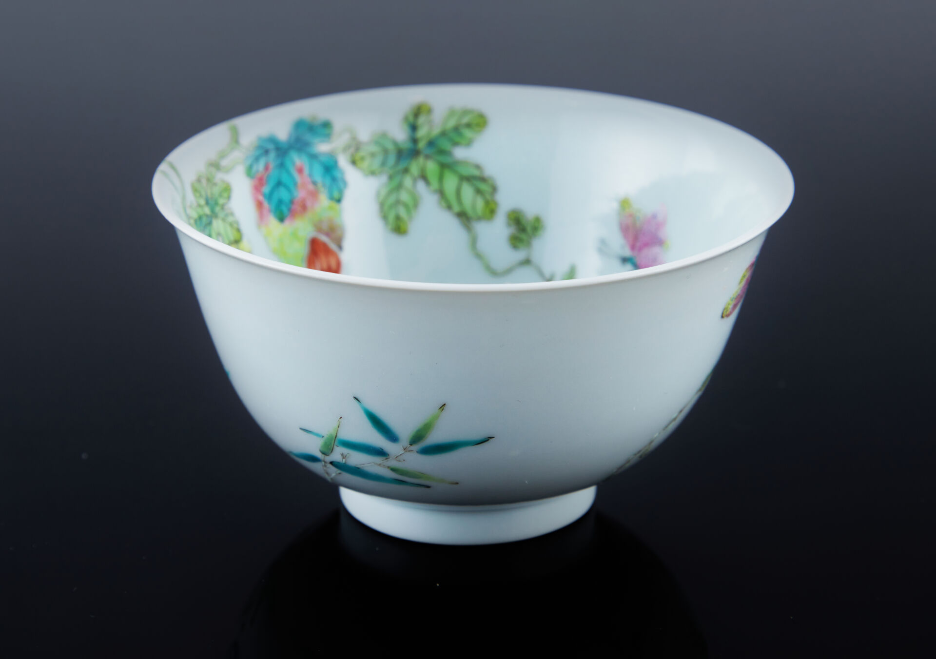 Bol en porcelaine à décor émaillé polychrome sur les parois extérieures et intérieures de melon amer dans leur feuillage, bambous et papillons. Au revers, la marque de Daoguang en zhuanshu en bleu sous couverte.