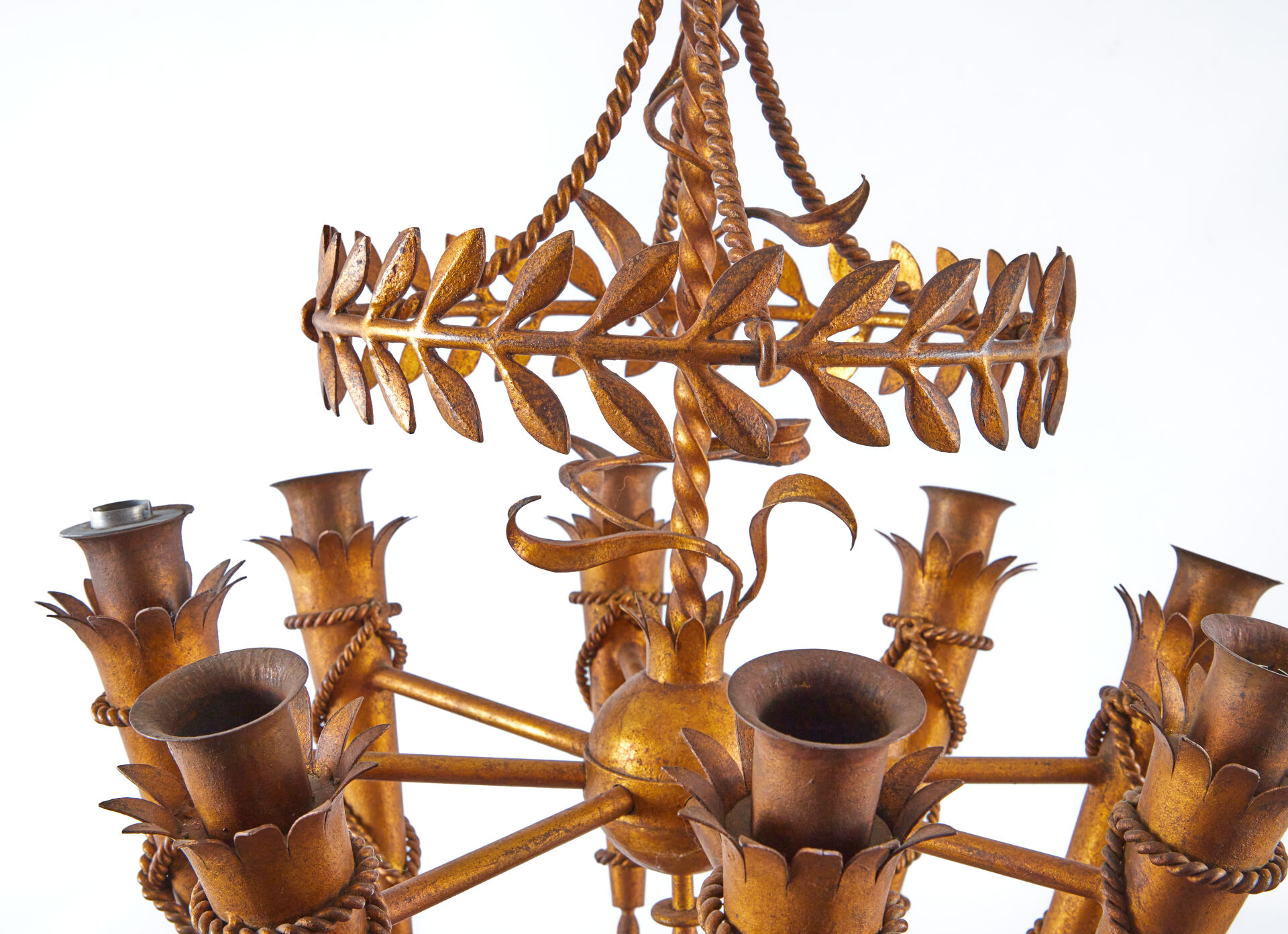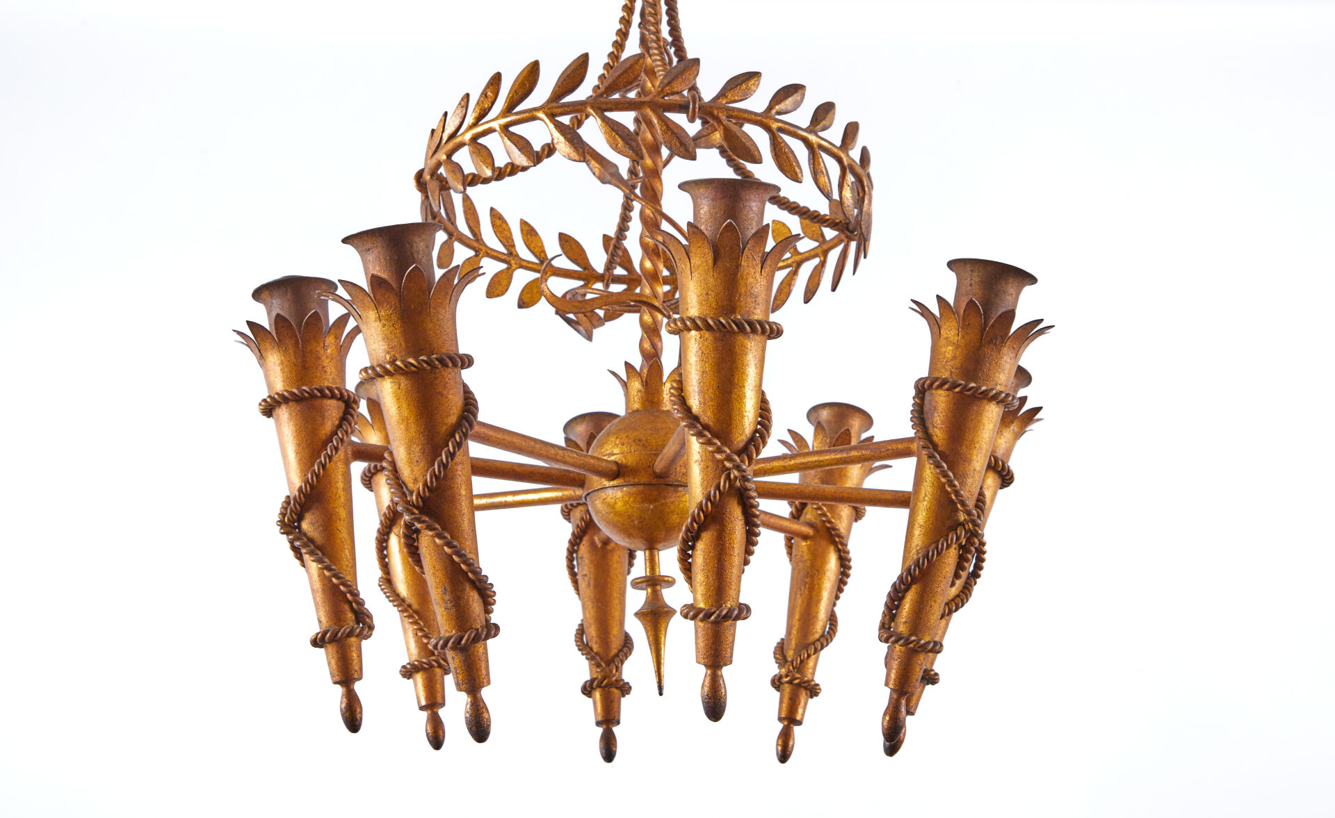 Présentant huit bras de lumière façon torchères à sphère centrale surmontée d’une tige torsadée et d’une couronne de feuilles de laurier