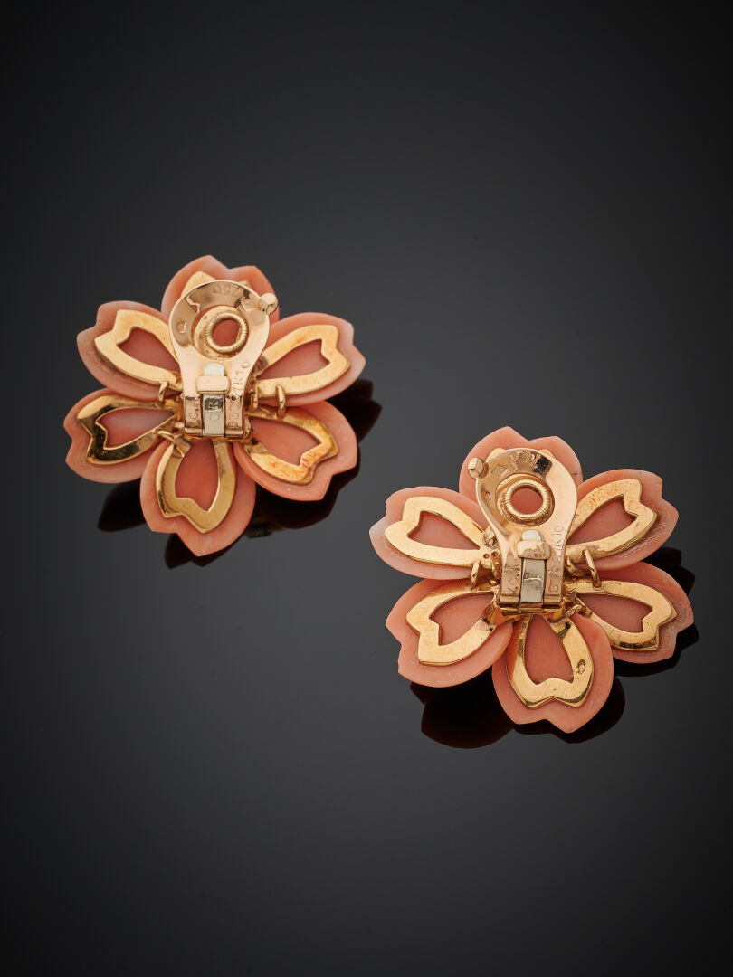 Paire de CLIPS de d’OREILLES « Roses de Noël » en or jaune (750‰) orné de six pétales de corail, le pistil serti de six diamants taille brillant.